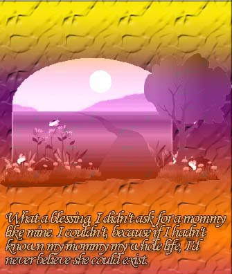 Was I the perfect child: not even on my best day But even on my worst day, my mommy loved me When others said no, my mommy made a way When I knew no better, her love made me see And I know I can never repay this love If I tried for all my life it could not compare To this love sent me by our God far above I'll never deserve her but I will try to care For most of my life, it was like 2 vs the rest And for all my life, I'll know: My Mommy's the best |